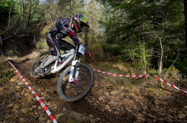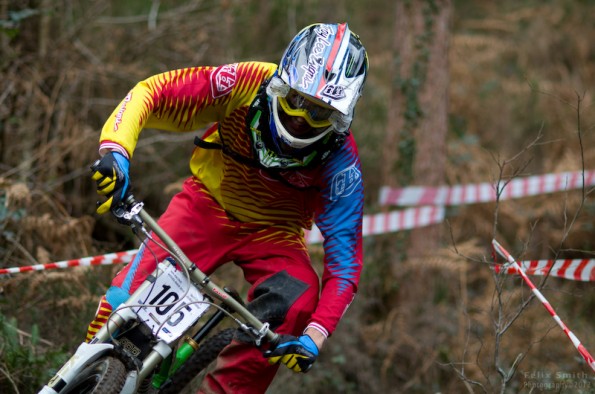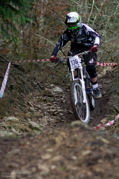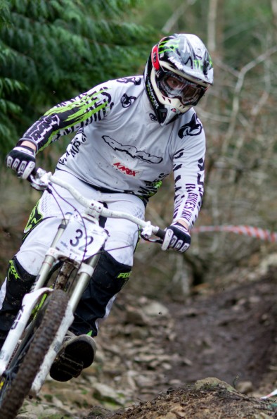 And so it was that 80 odd adrenalin charged challengers found themselves at the start ramp of Round 1 of the Woodland Riders Winter series. Practice started at twenty to ten. Bikes and riders all adorned with shiny trinkets fresh from Santa’s bulging sack started merrily throwing themselves down the hill with gay abandon. It wasn’t long before those who had been putting their feet up (some enforced but most voluntarily) were being found out. Complaints that they were ‘not feeling it’ and ‘knackered by the first fire road’ (crossing) started to work their way up the hill, gathering pace like an out of control snowball. By the time practice came to a close at 11:45am the flow of riders to the start ramp had thinned to a trickle. An opulent Christmas and pedaly top section were taking their toll.