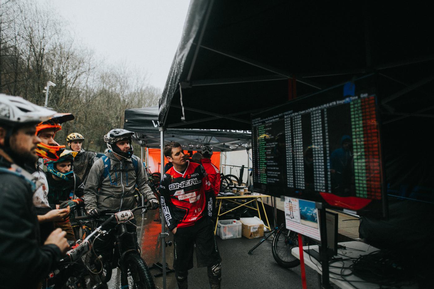 The morning started off fairly dry whilst the riders begun their first round of climbing to warm up. The climb was described as “long and mellow” which helps make them more accessible to newer riders, and also means that less juice is spent in the climb, allowing the racers to put down more laps and harder runs.
