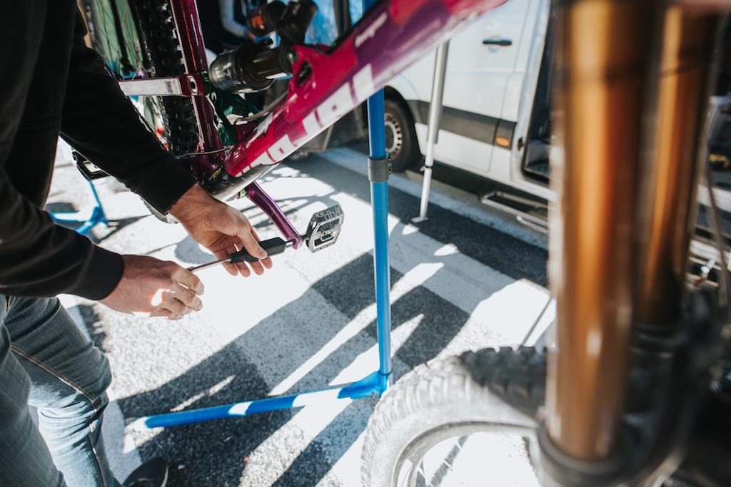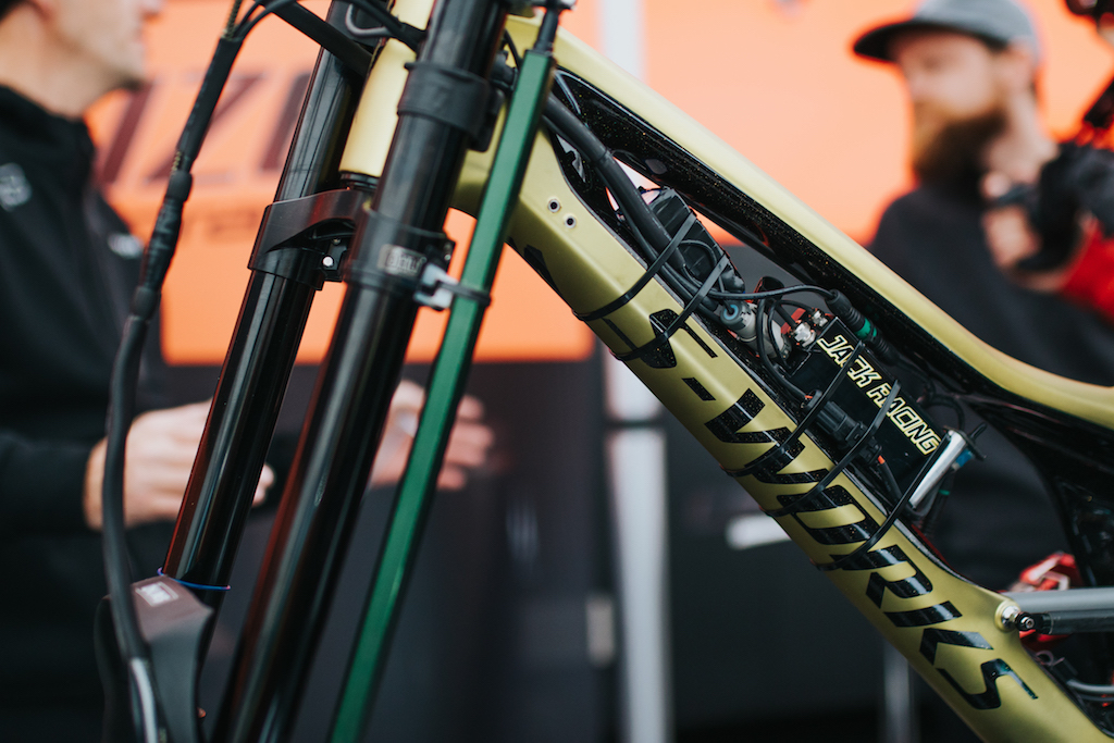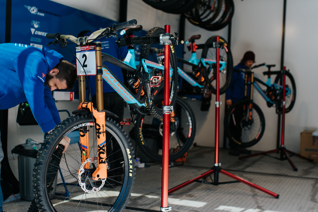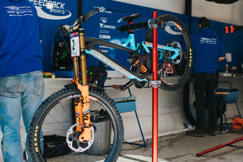 Not only was Loics new bike ready and raring to go, but his mechanic was working on his testing Demo with the telemetry equipment still attached.