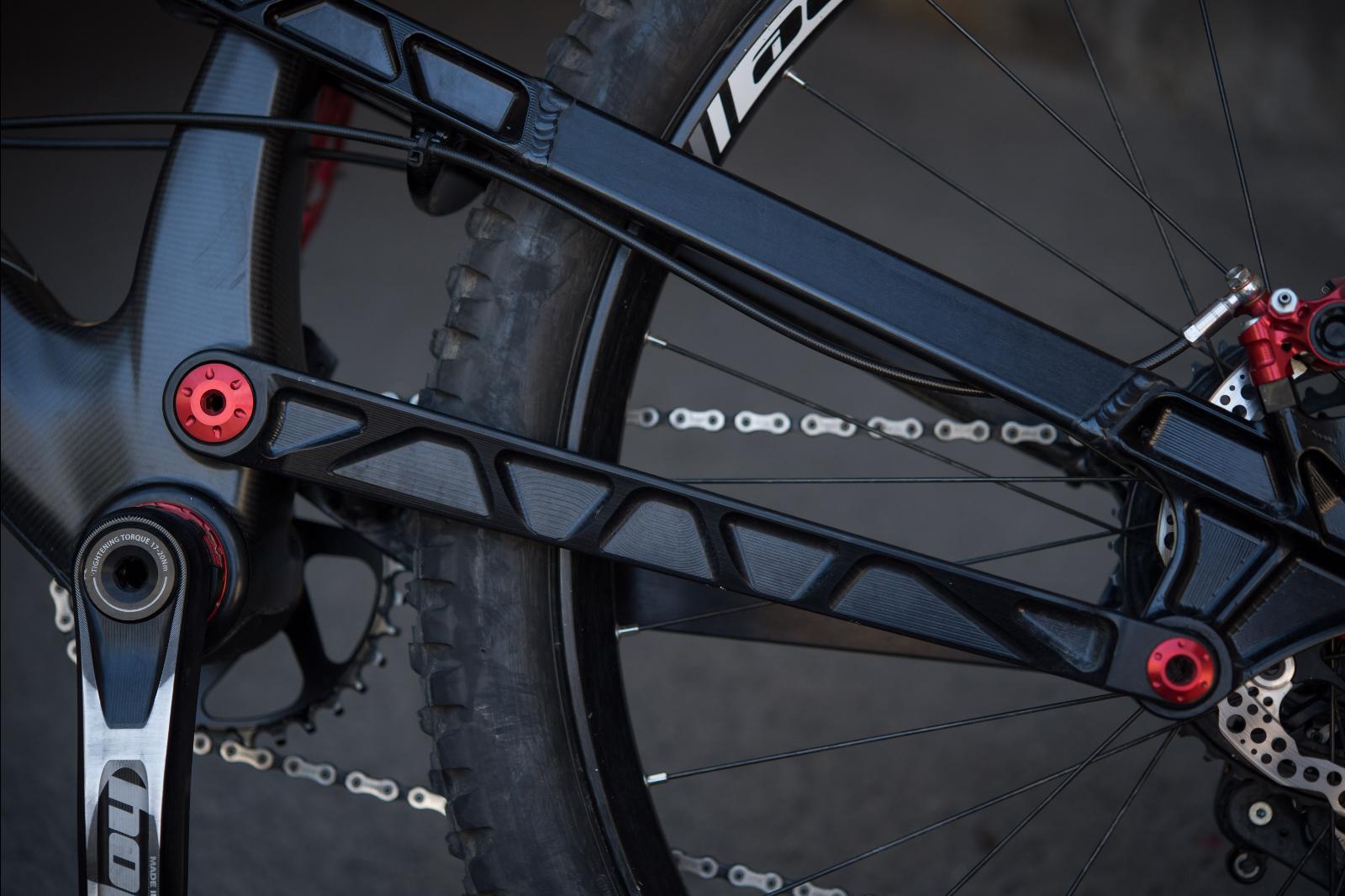On arrival in Briançon we were greeted with cold beers and an array of carbon prototype frames, CNC’d moulds and cleverly engineered rear-triangles. Engineer Guillaume explained some of the nuances of the bike’s design; such as a radially mounted rear brake, the spacing of the rear triangle (achieving a similar effect to ‘Boost’), bonded rather than welded aluminium and Horst suspension linkage.