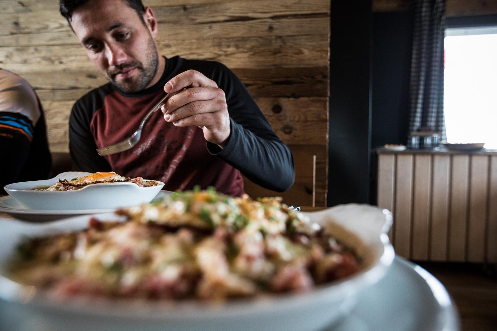 Following Thomas, or rather attempting to, was an eye-opener. Riders of that calibre read the terrain completely differently to a mere mortal like myself, playing and popping off seemingly nothing, and doing it with such a casual swagger as I’m pouring all my focus into merely keeping him in sight. The trail eventually fizzles out and pops us onto a road in the Sertig valley which induced a speed tuck content as we roll into the accommodation – our bags waiting for us thanks to more Swiss efficiency in luggage transfers.