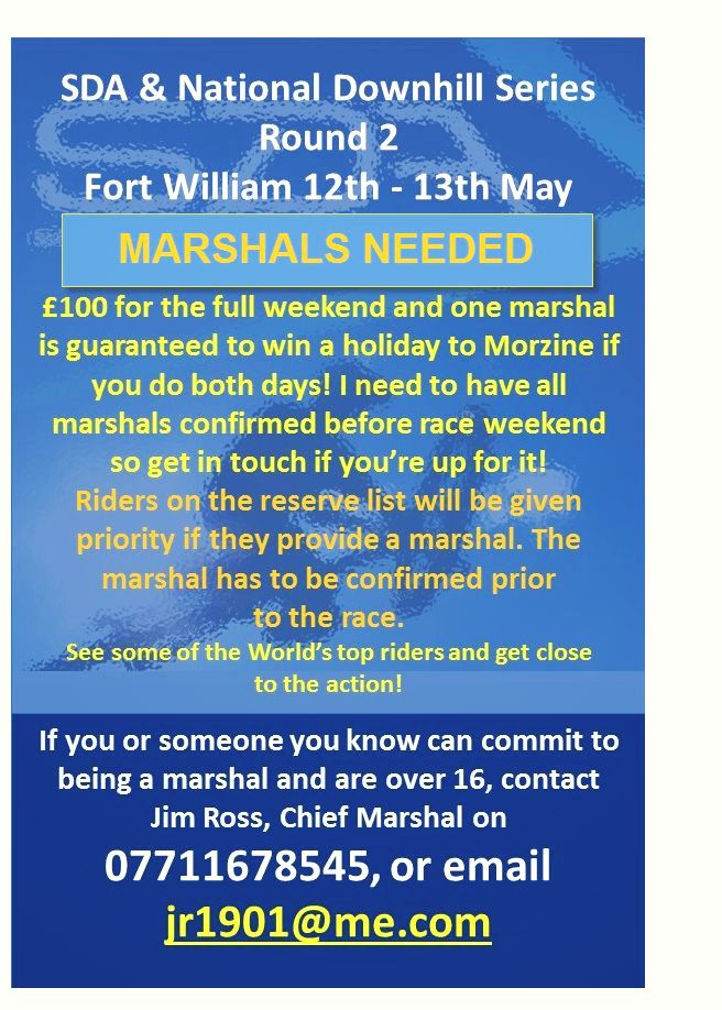 Round 2 of the Scottish Association Downhill and British National Downhill Series’ on May 12th and 13th in Fort William need marshals for the event to happen.