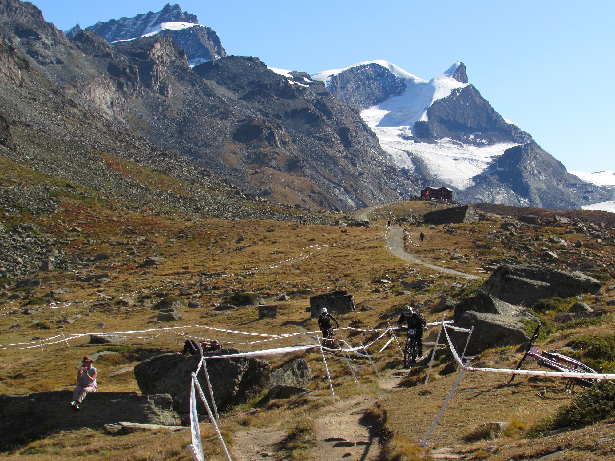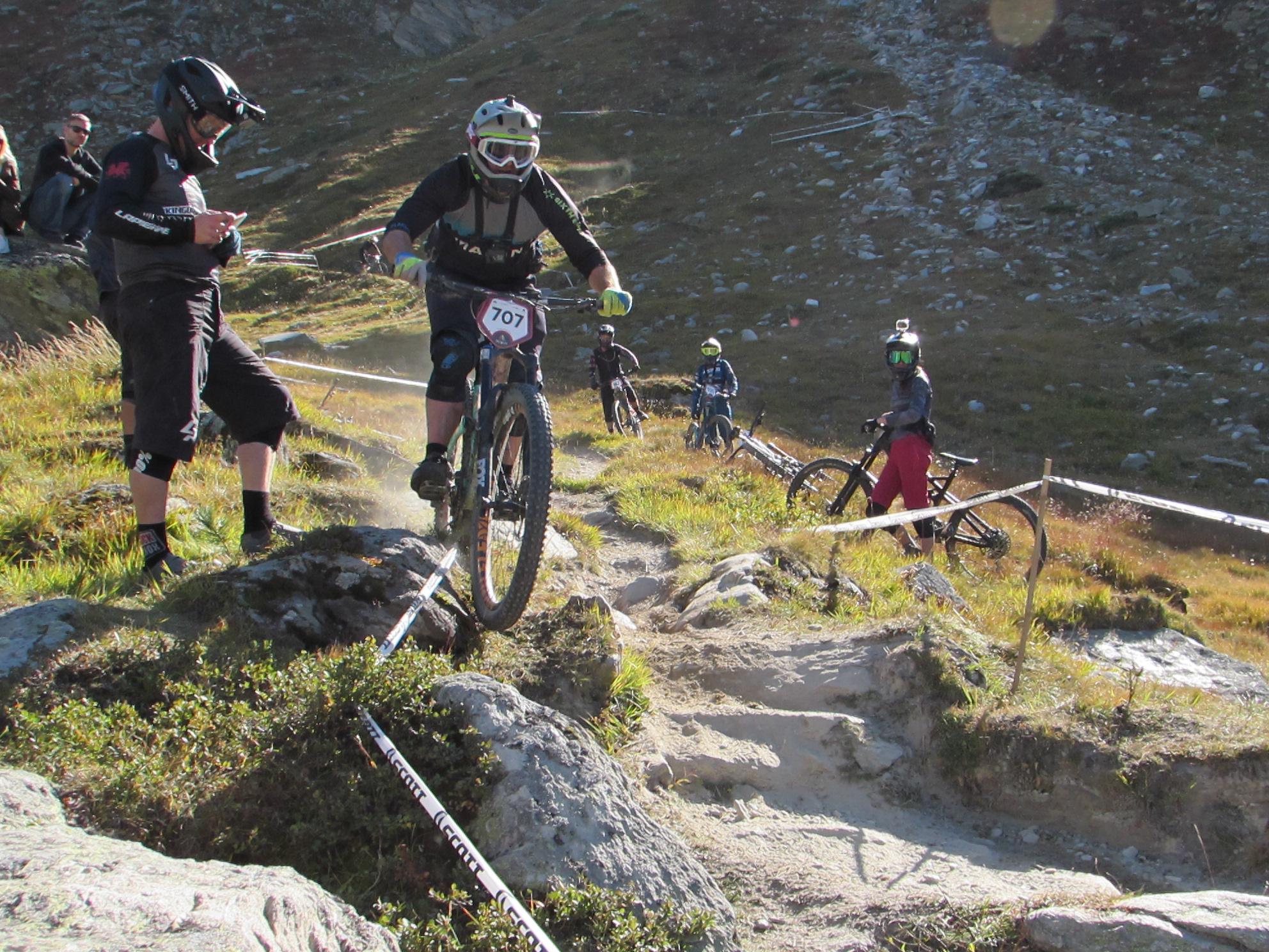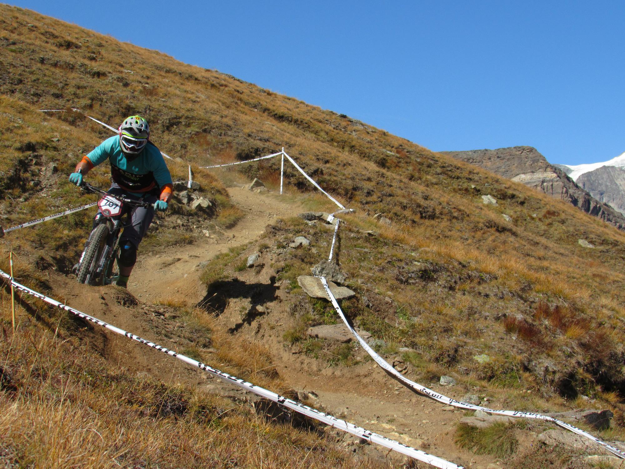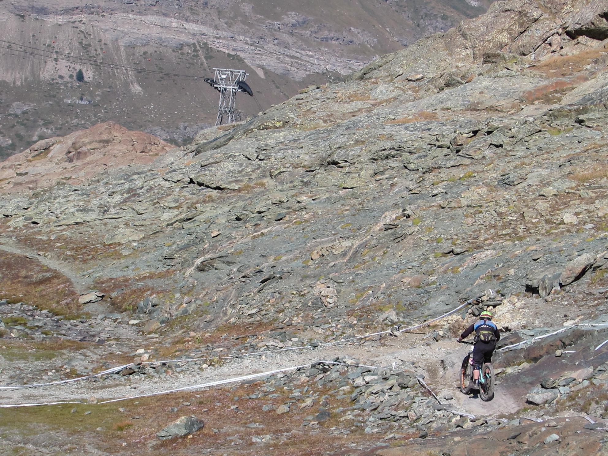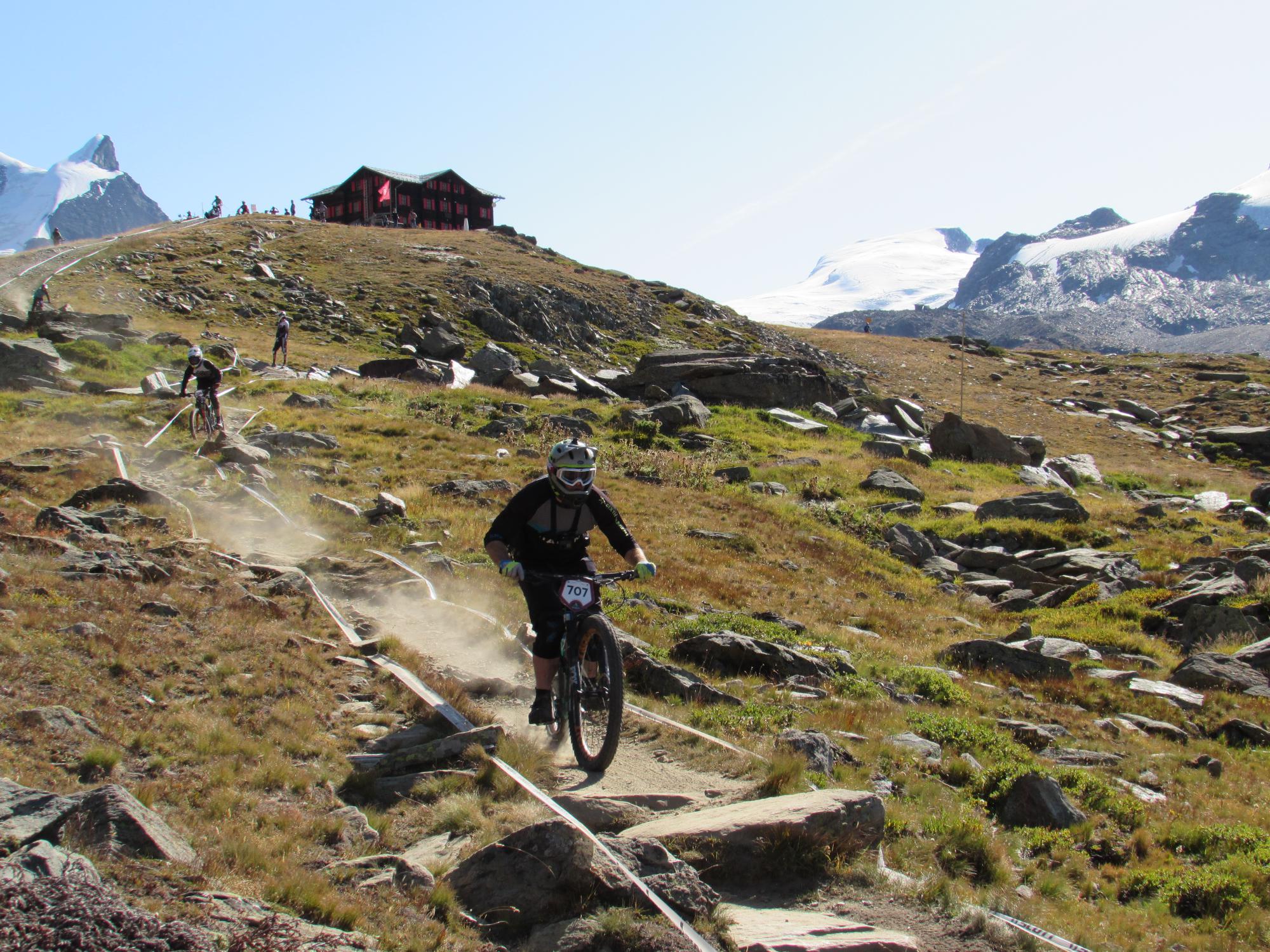 Stage 3 –We were taken back up into the glacial territory underneath the Matterhorn itself. This track was astoundingly rocky and with many portions of the track taped super wide it was easy to find yourself 10 metres too far left or right of the fastest, smoothest lines. There were two pinch climbs in the track, which at 9500ft meant you had to get the entries super smooth or find yourself coming to a track stand with not enough oxygen in the blood to provide the power to get up them. Whilst I got my lines smooth, I seem to have forgotten how to change gear at the right moment and found myself floundering in a crunch of metal. Having to run up these 2 climbs unfortunately spelled the end of my runs without being overtaken.