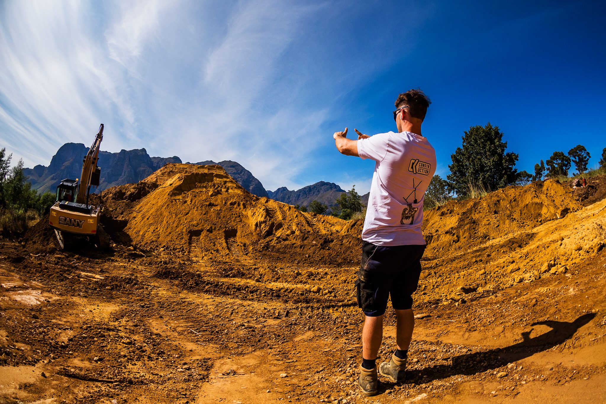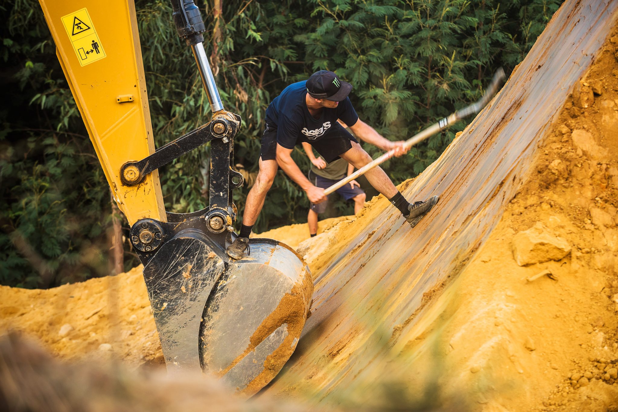 After the guys had created a new mountain for a landing on the new last jump, Nico was in charge of shaping and spreading the dirt around. It is massive and no small feat, but he’s got his head down and it’s already looking amazing. Clemens is on Rocket Launcher duty. Shaping the lip and trying to get it as close to what they had last year. With the help of a new toy to measure the angle and distances they are keeping it at the 60 degrees like it was before, which looks way steeper than it sounds.