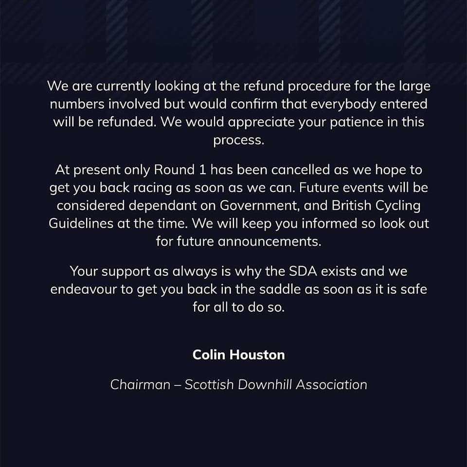 With no date for rescheduling, the Scottish Downhill Association will now begin the process of refunding the entries, but asks for patience as the team of volunteers works through the hundreds of entries.