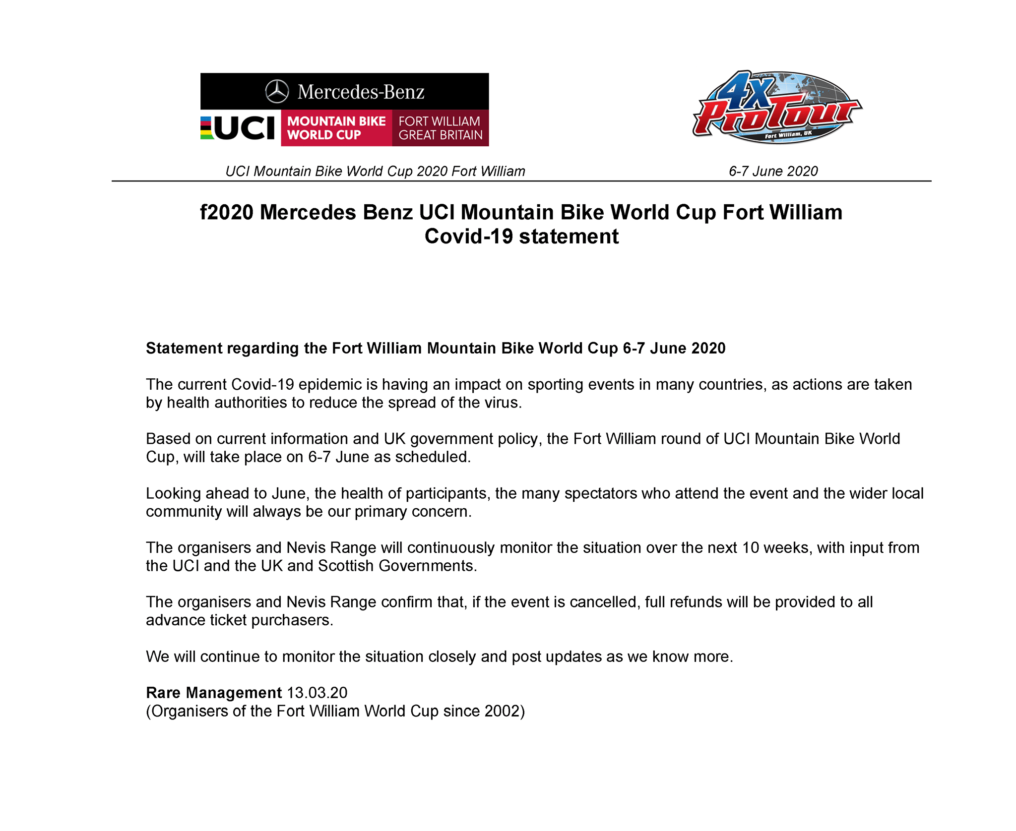 With the opening World Cup cancelled and Fort William only ten weeks away, Rare Management have released a statement on the event.