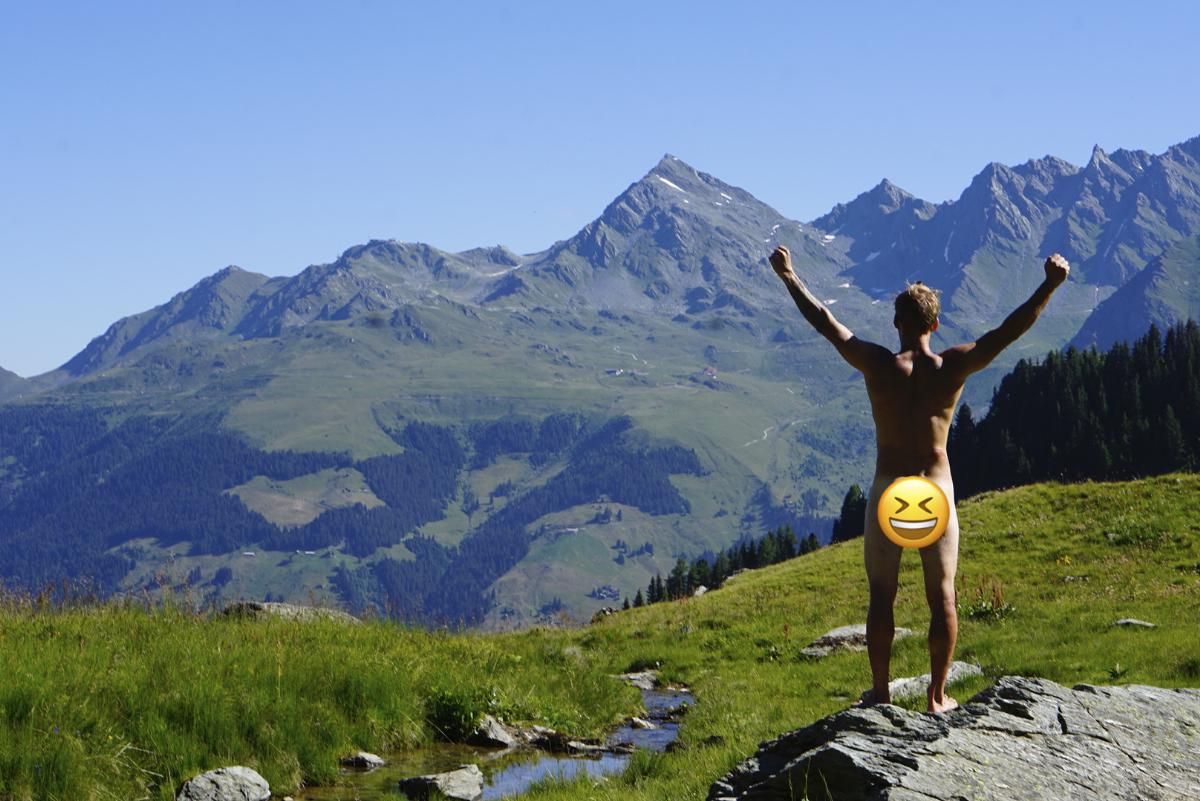 The next morning was beautiful. We’d brought pretty basic breakfasts with us, so we ate and then set off down the grassy, sunlit slopes. The descent was fantastic, even with our huge backpacks and stopping early on to take in the views. Halfway down we found a lake which needed swimming in, and a mountain view with a rock that needed to be stood on to dry off and pose, in Christian’s case, naked.