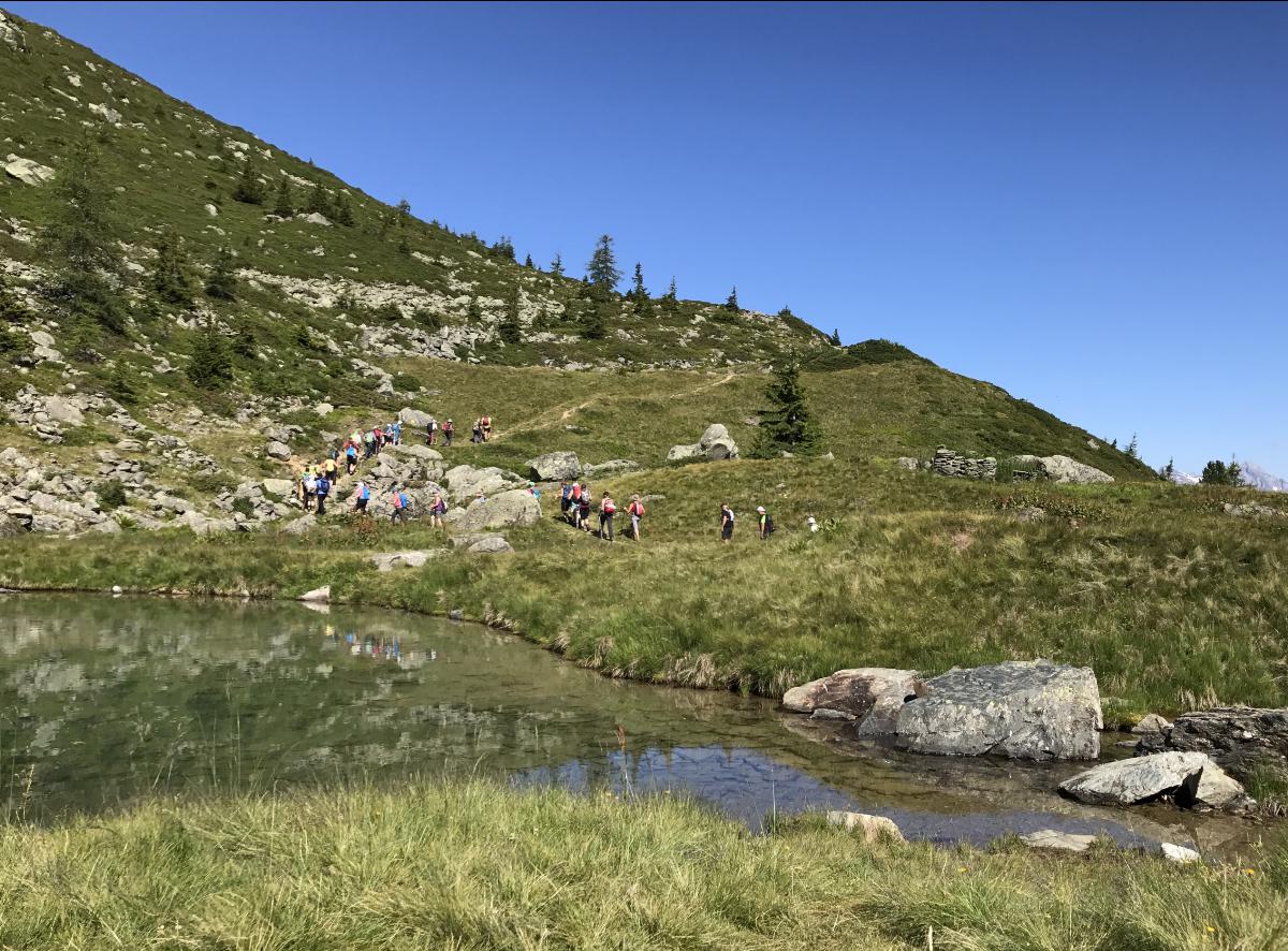 We got to the bus just in time, caught our breath on the way up to 1600m and then got spat out at the top of an alpine road to figure out where to go next. We had an idea, either on a map or at least on a phone, and way signs in the Alps are very helpful. The climb was a mix of singletrack and pretty brutal, steep fire road sections. After the last fire road it was a slog across bumpy, boggy pasture and in the distance we could see a final kick. The last 100m, as the crow flies, was made up of 10 hike-a-bike switchbacks which gained 100m elevation. It was steep…