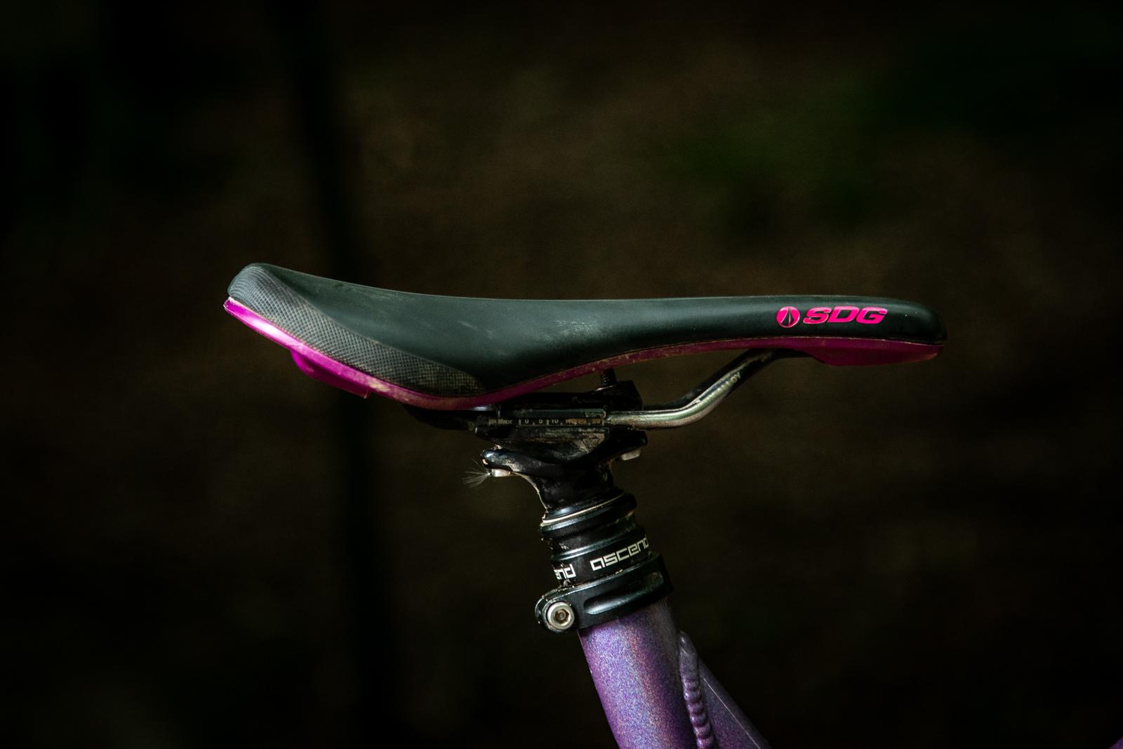 I did some really big days on the purple SDG and basically didn’t notice it, which is a good thing. It seems to be really well made, and after some big crashes and being dropped a few times it basically looks brand new. In the wet and mud, you didn’t slide around on the saddle surface and the only drawback was that the central groove packed full of mud that I had to scrape out mid-ride. There were no creaks from the rails during the test either.