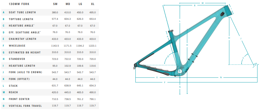 Sizing runs from Small to XLarge, with reach on the medium at 445mm, combined with a 410mm seat tube at 76 degrees. Chainstay length is static at 433mm through the size range.