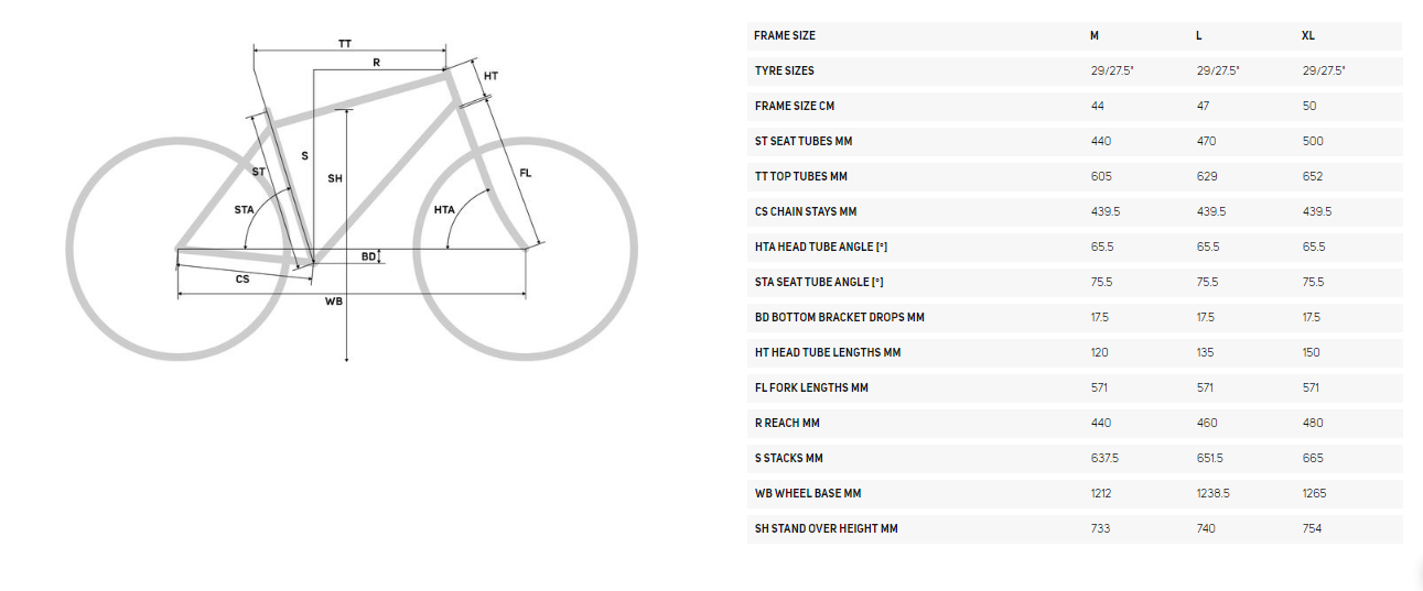 Speaking of geometry, you get a Medium, Large and XLarge options, with the medium sporting 440mm in both the seat tube and reach departments. Head tube angle is 65.5 with a 75.5 degree seat tube angle. Chainstays are 439.5mm long and are fixed across all sizes.