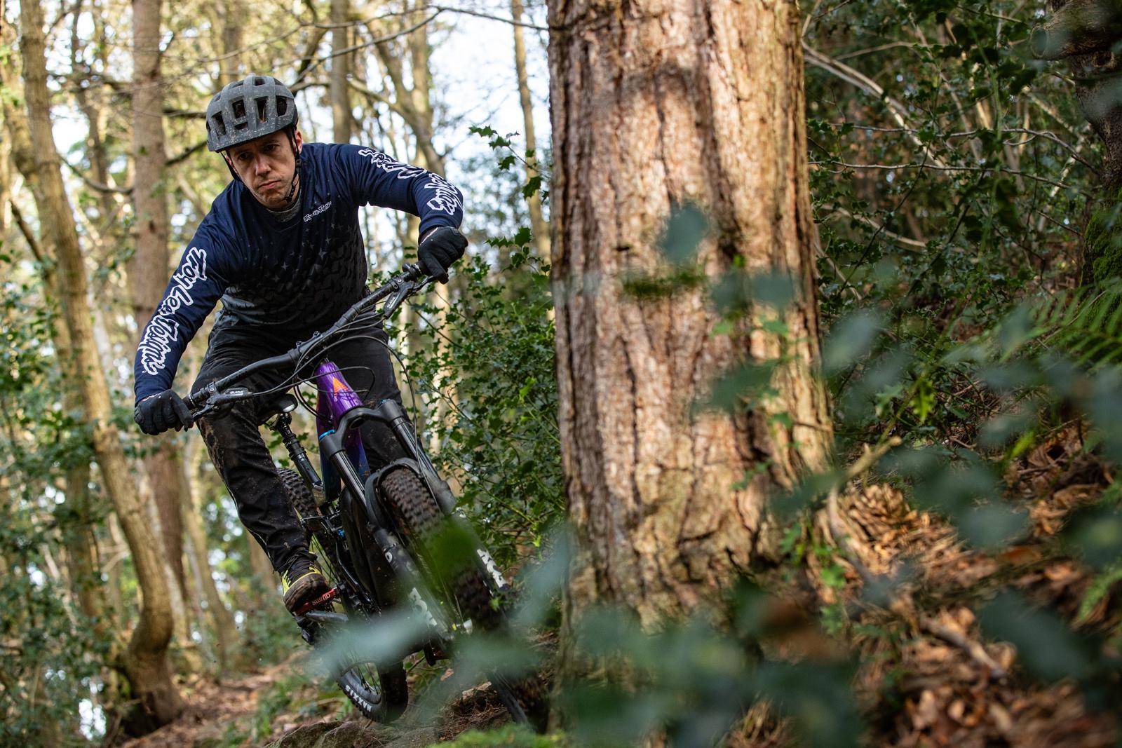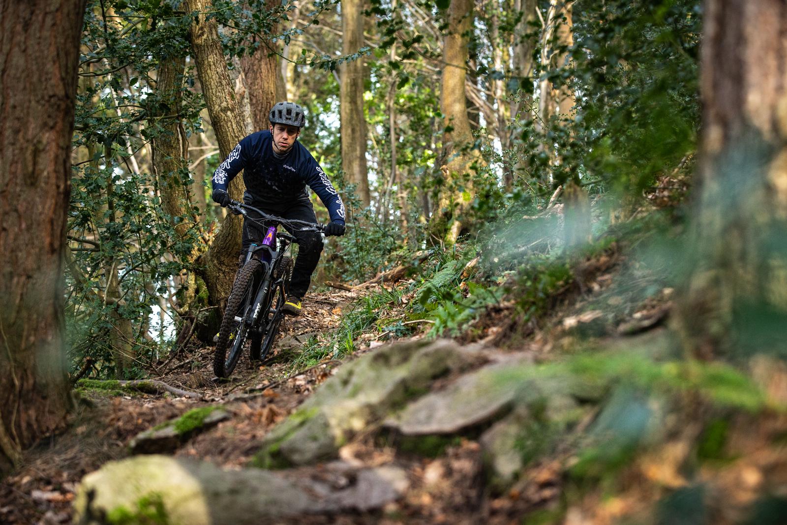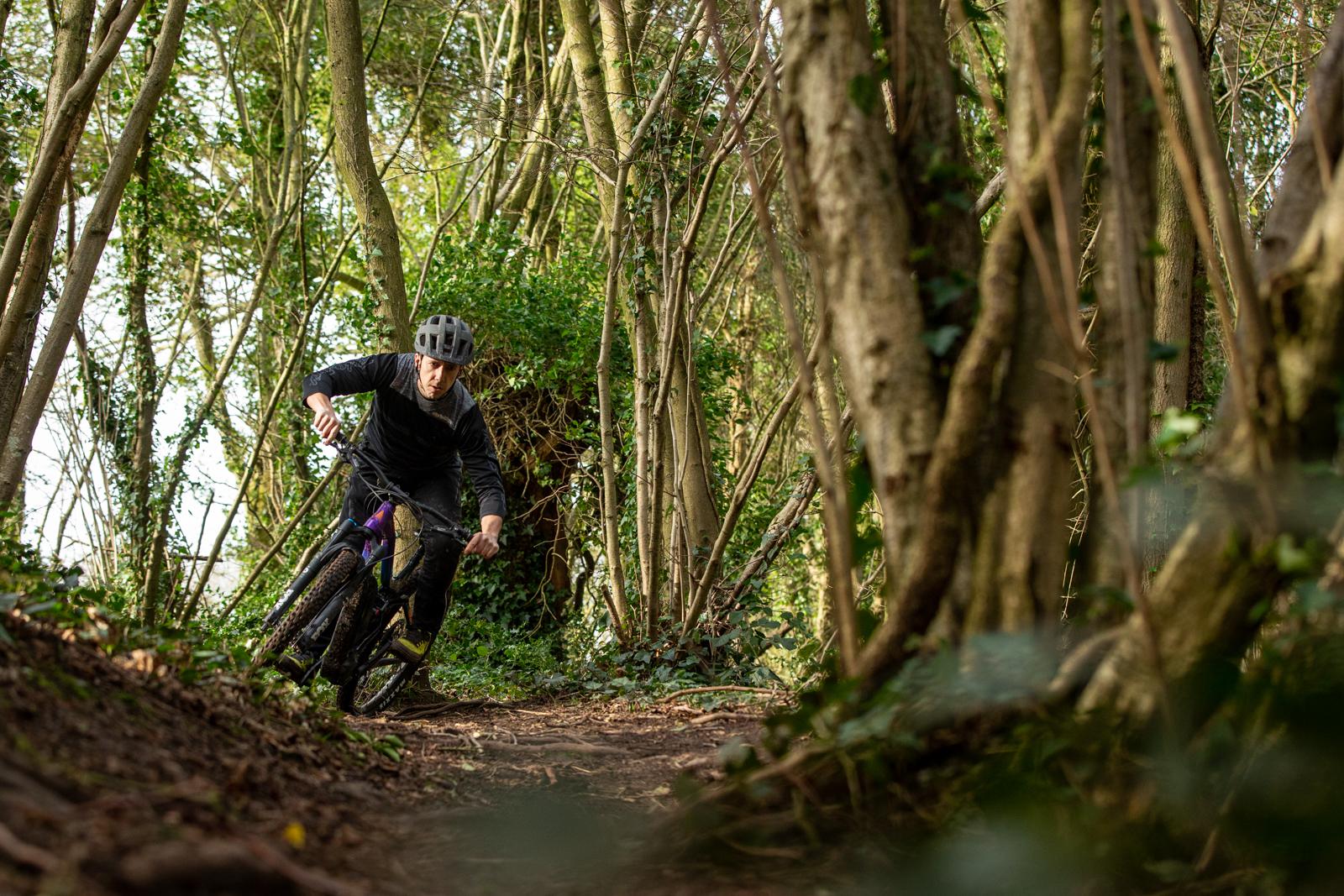 The 27.5” wheels do turn in nicely, especially as I have been riding 29” all summer on my other test bikes. You can carve a lovely smooth line as the bike feels so composed and solid under your hands and feet. The low standover, lets you drop a knee in and helps you to get some decent lean angles around tighter turns and between trees.