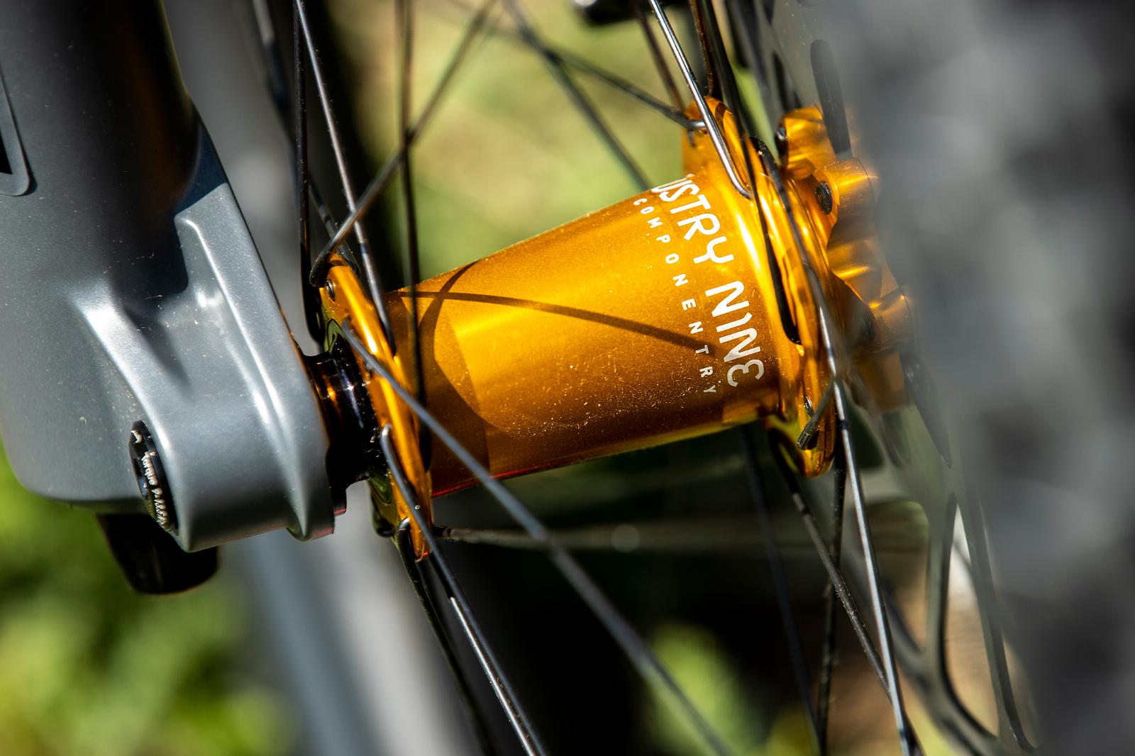 Reserve 30 Carbon wheels with bling bling gold Industry Nine Hydra hubs to match the Tan accents on the frame. I run them tubeless. Loving the Maxxis Minion DHF DD 2.5 WT Max Terra in the back & an Assegai Double Down Max Grip 2.5 in the front.