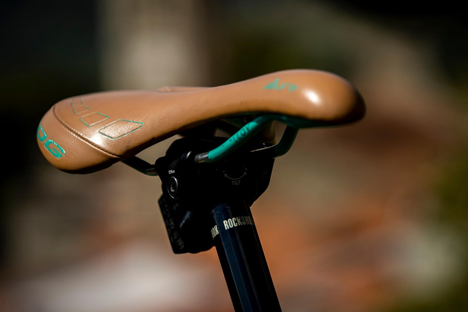 SDG custom leather “vintage” women’s Allure saddle paired with the new Rockshox Reverb AXS dropper post 150.