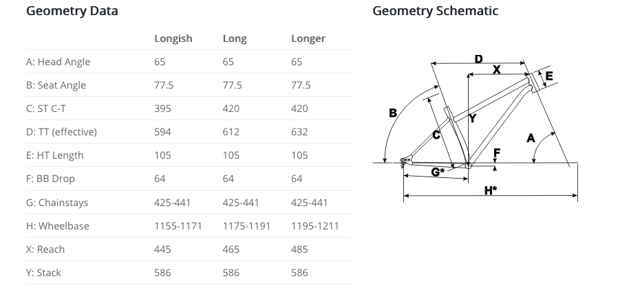 On the Long frame, you get a 65 degree head angle, and a 77.5 degree seat tube angle, a roomy reach at 465mm combined with a 420mm seat post. Chainstays are adjustable between 425 and 441mm, with the wheelbase changing between 1175 and 1191mm.