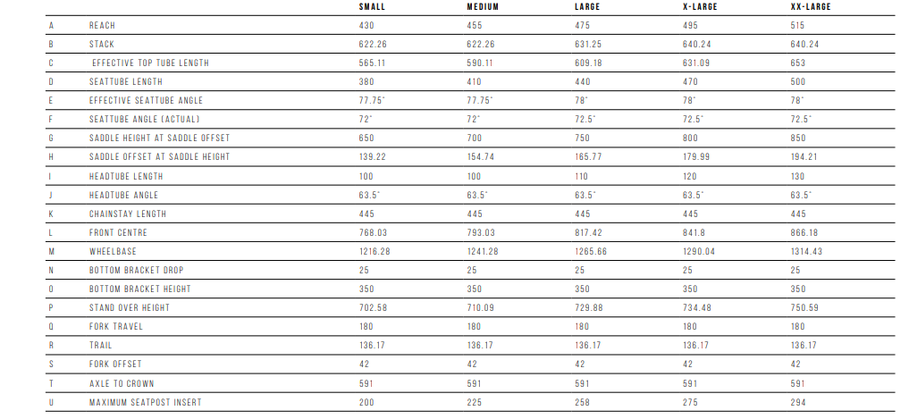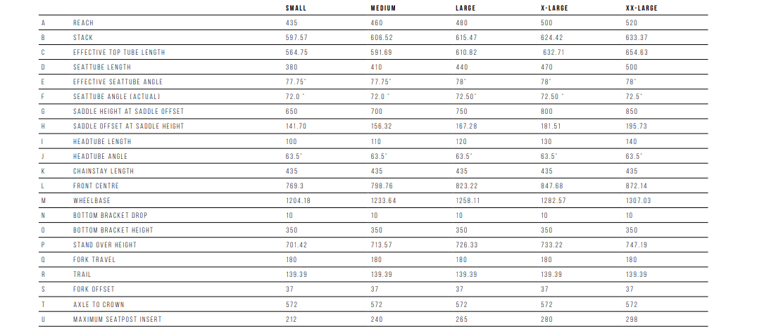 Bump up to the bigger wheels and the medium Giga 290 offers you a 455mm reach on the same 410mm seat tube. Head and seat tube angles remain the same at 63.5 and 77.75 respectively. Wheelbase extends to 1241 with a suitably long 445mm chainstay.