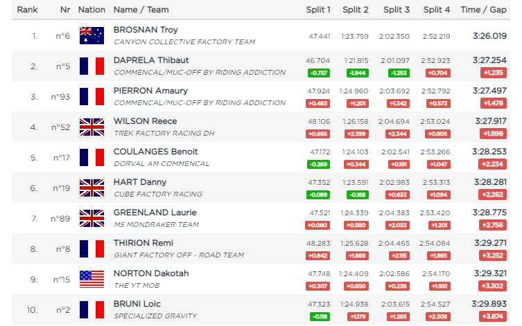 Amaury Pierron would lay down a strong run early and sat in the hot seat for an hour plus as the race headed to the sharp end. Thibaut Daprela’s run was WILD. Despite a stall in the woods he’d pip Pierron to take the hot seat.