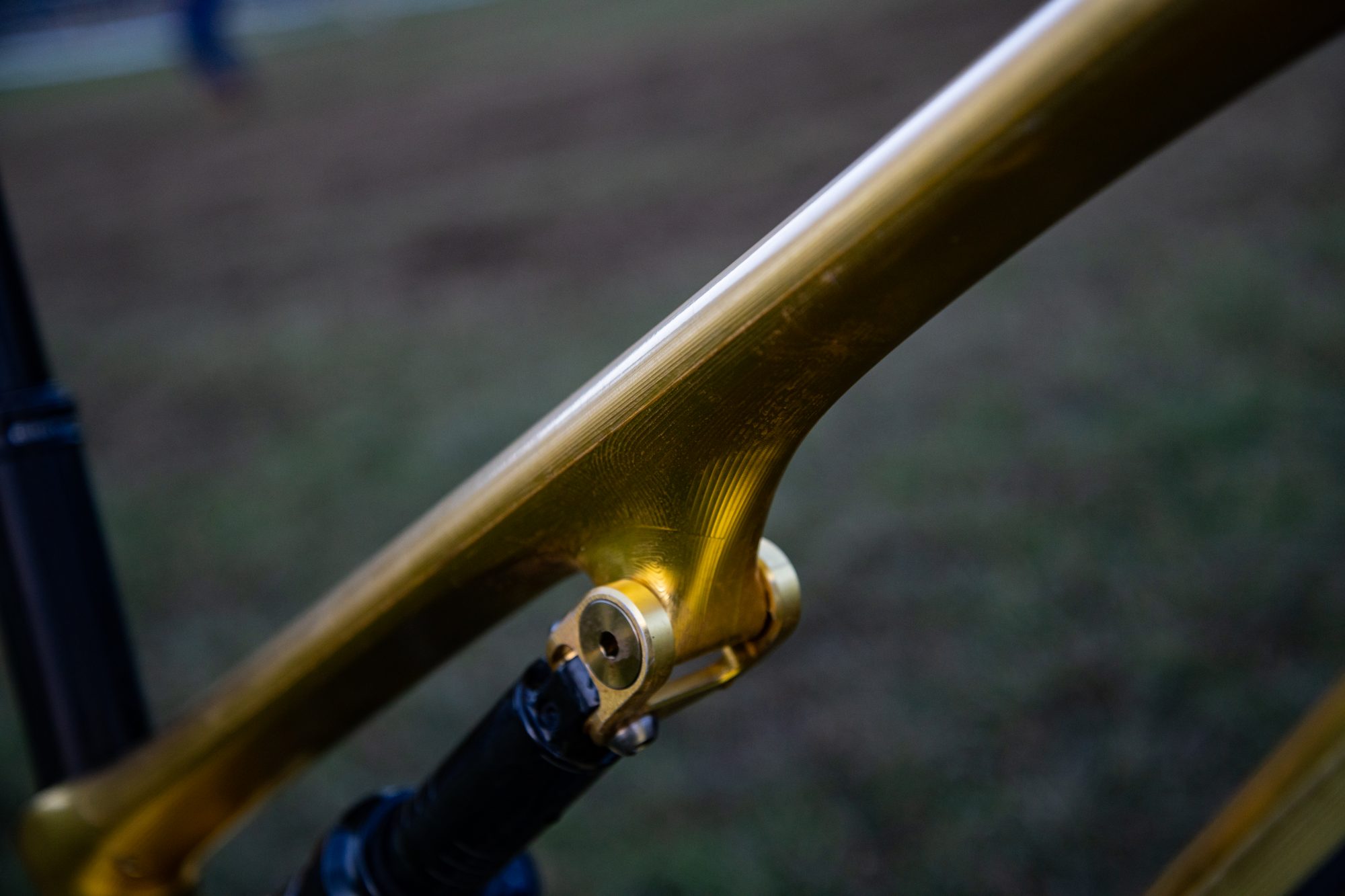 The Pole Bicycles’ ‘Goldmember’ prototype bike was borne from the two-year development of the Voima ebike. The goal was to have a suspension system that could work with both ebikes and regular bikes, so in that respect, this prototype will prove if the design has worked.