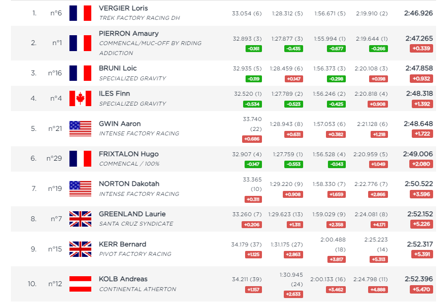 Here come the French… Vergier leads Pierron by 0.3, who leads a back-to-form Bruni by 0.6. Bruni leads his team mate Finn Iles by 0.4.