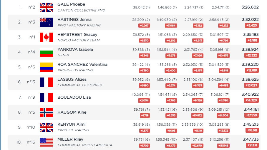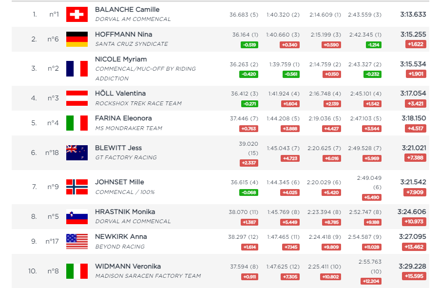 Cami Balanche once again takes the full 50 points for the qualifying win, but the womens’ field is tight with Nina Hoffman 1.6 back, and your Lenzerheide winner, Myriam Nicole just 0.3 back on the Syndicate rider.