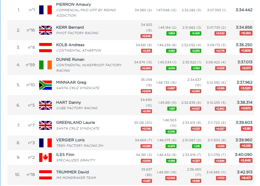 Bernard Kerr shows just how good he is by blitzing the track all the way down to take the lead from Kolb by over a second and a half… Only Pierron can stop the Pivot man winning his first World Cup.