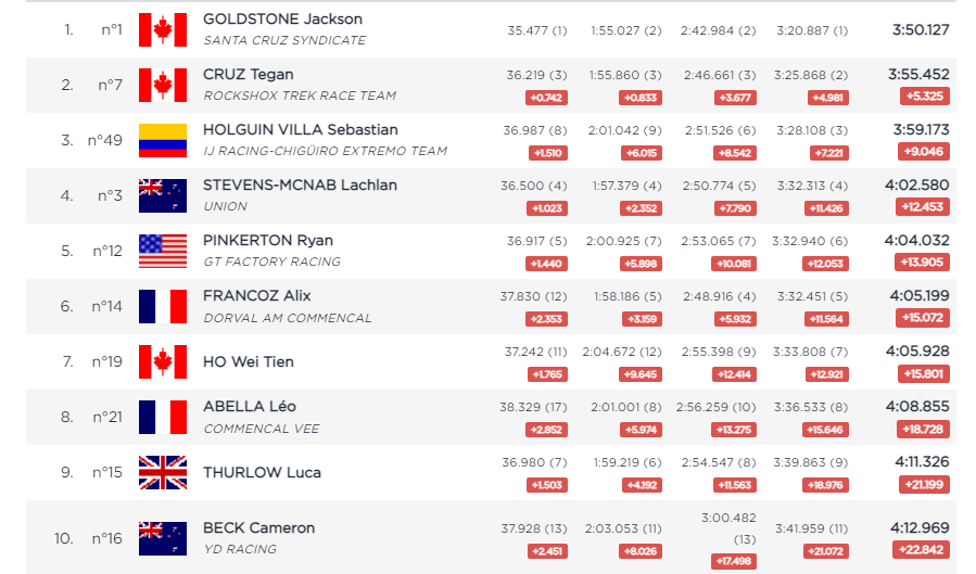 It might not have been twelve seconds this time, but Jackson Goldstone would put over five seconds into Tegan Cruz who is now comfortably a top three rider. Sebastian Holguin Villa would complete the top three.