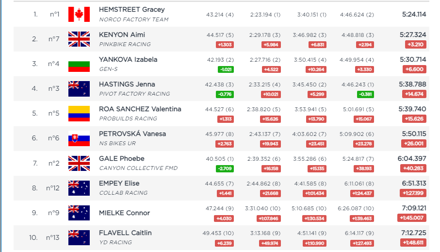 Gracey Hemstreet would take the win in Snowshoe, capitalising on a disastrous run for Phoebe Gale, who was 2.7 up at split one before being 16+ down at split two. Aimi Kenyon had a flyer for second, just 3.2 back, with Izabela Yankova completing the top 3.