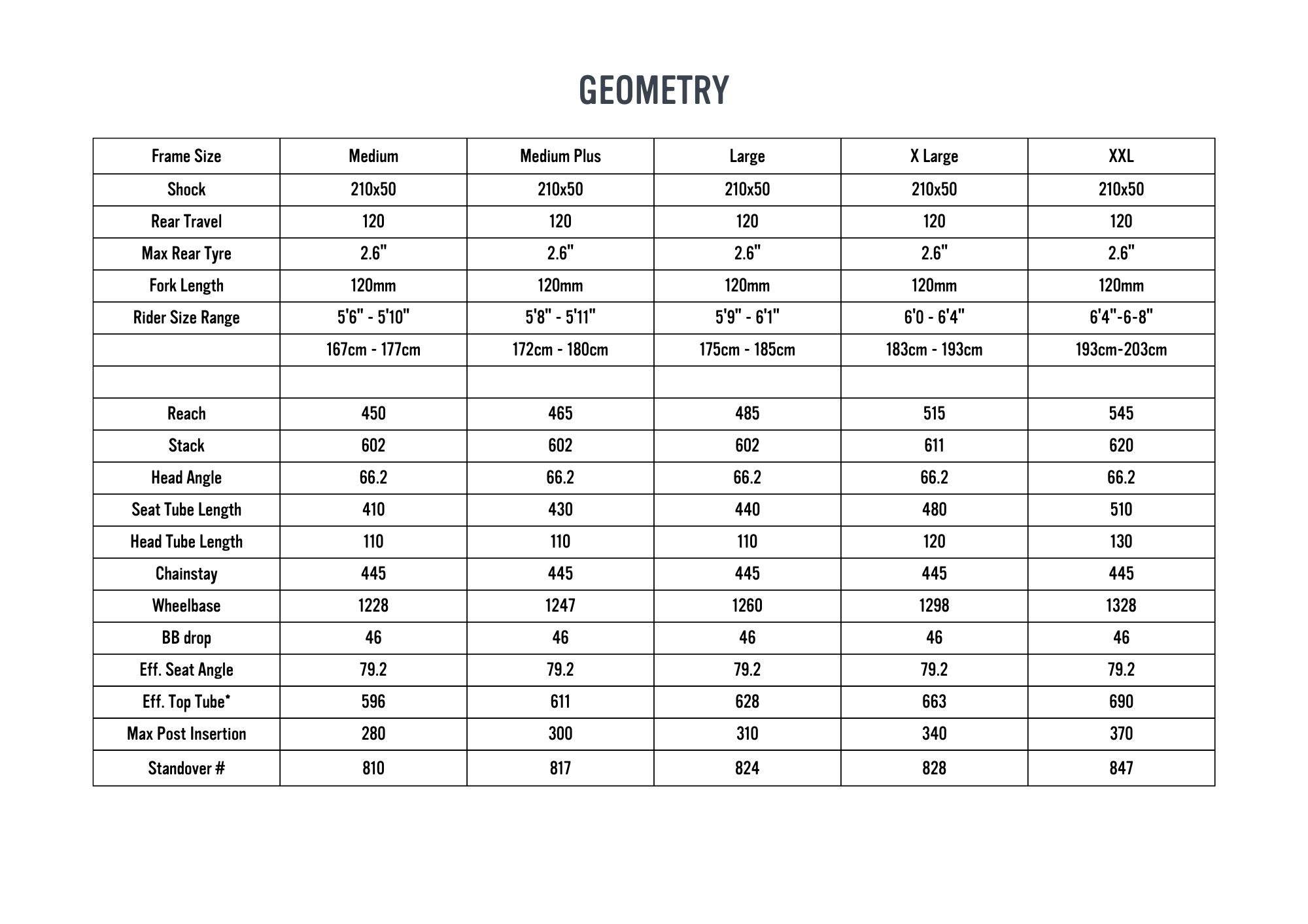 Reach on the Large is 485mm with a seat tube of 440mm. Head tube angle is 66.2 degrees with an effective seat tube angle of 79.2 degrees. Chainstays are 445mm across the sizes with a wheelbase of 1260mm.
