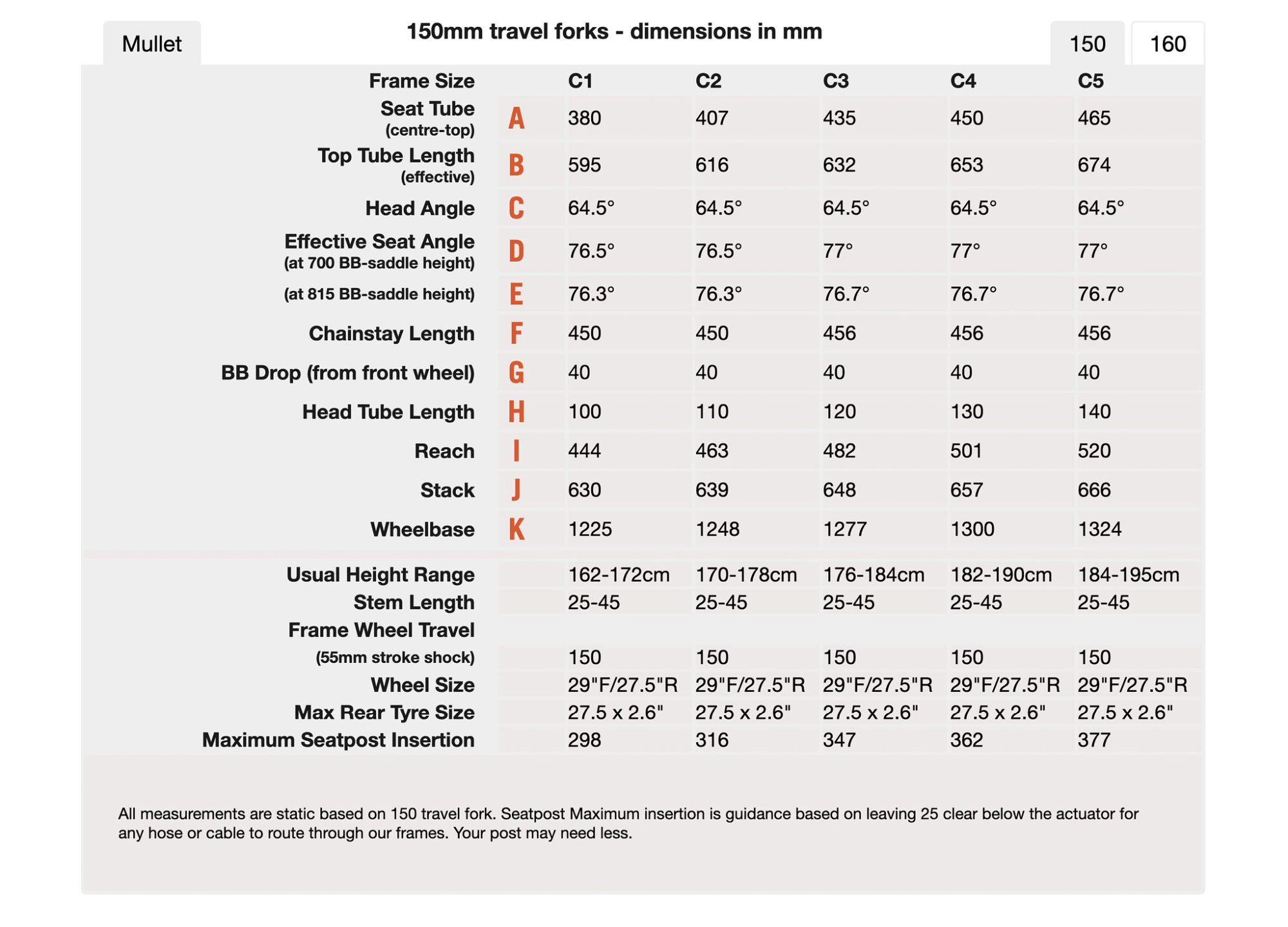 Reach on the C3 with a 150mm fork is 482mm with a seat tube of 435mm. Head angle is 64.5 degrees with an effective seat tube angle of 77 degrees. Chainstays are456mm with a wheelbase of 1277mm.