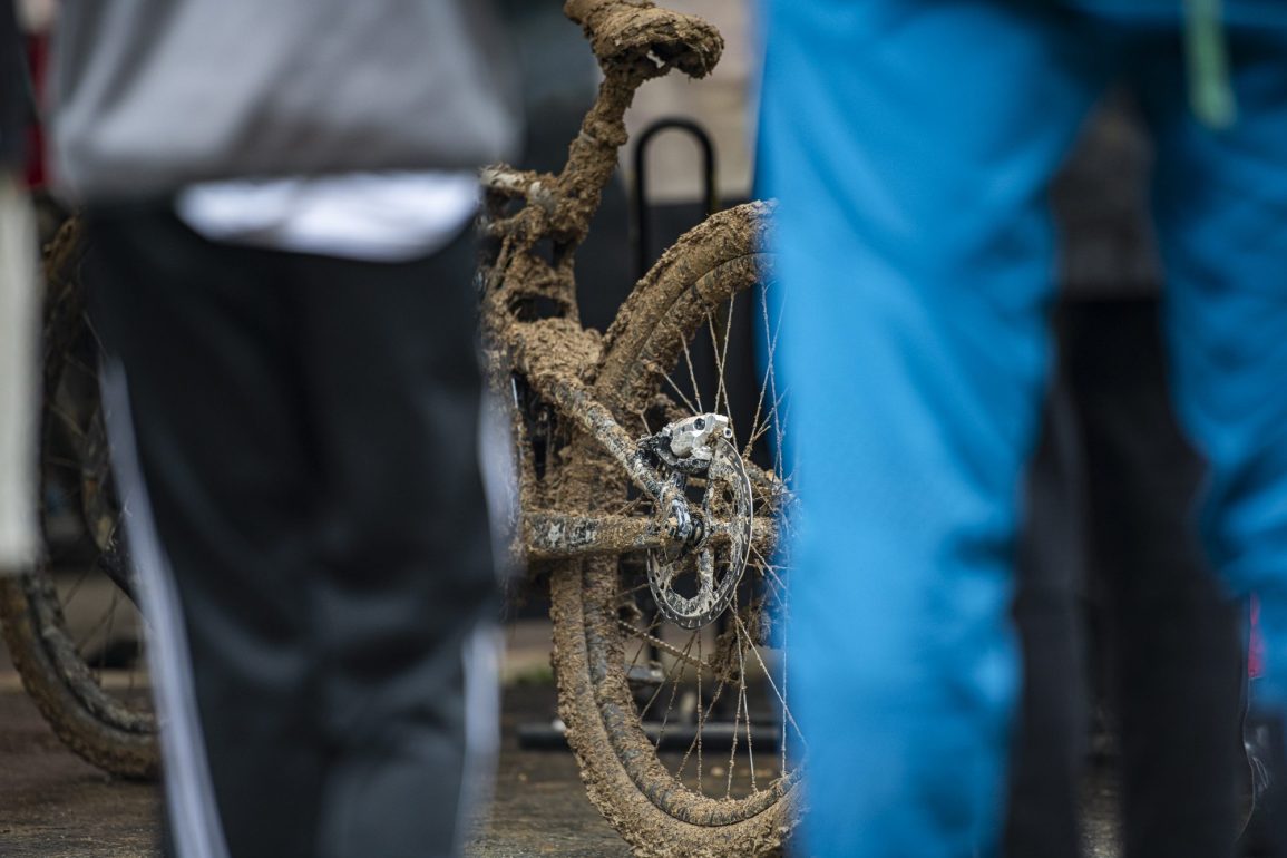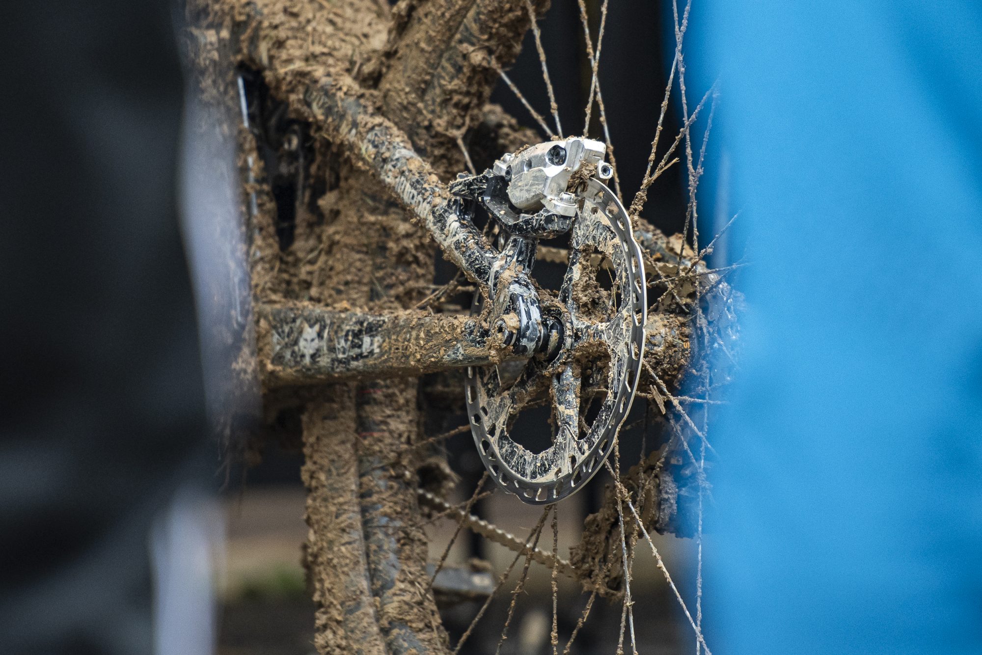 One of the only things visible through the clart on Jackson Goldstone’s Santa Cruz V10 was a large silver caliper that had no markings of any kind…