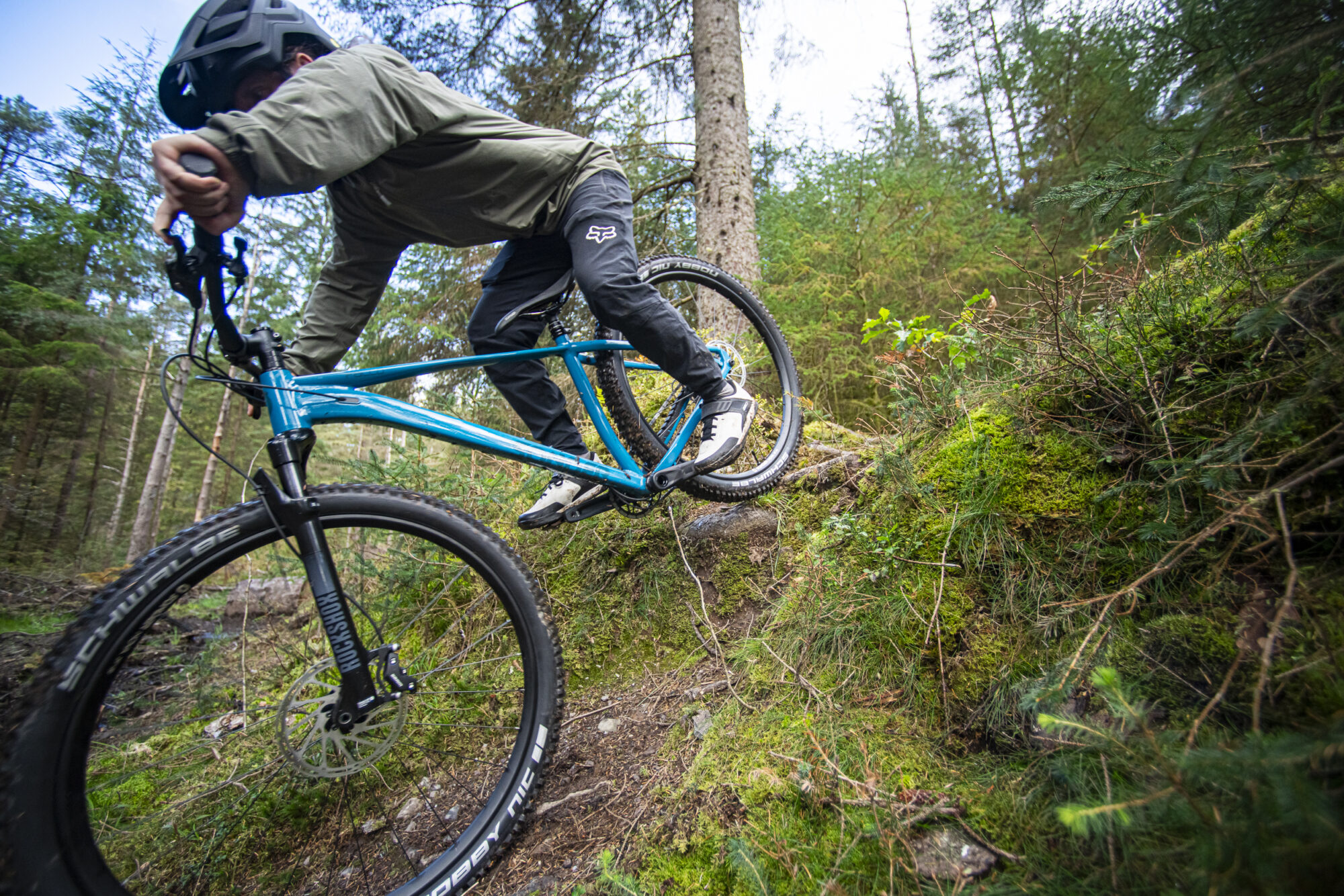 As you point the bike downwards, the same speedy rubber and sensibly light wheels whizz you along and despite the high pressure to see of punctures, the Nobby Nics were doing a fine stint of gripping the damp forest floor. The frame has enough twang in it to take the edge off the drops but doesn’t feel sloppy when it’s fully loaded or when sprinting.